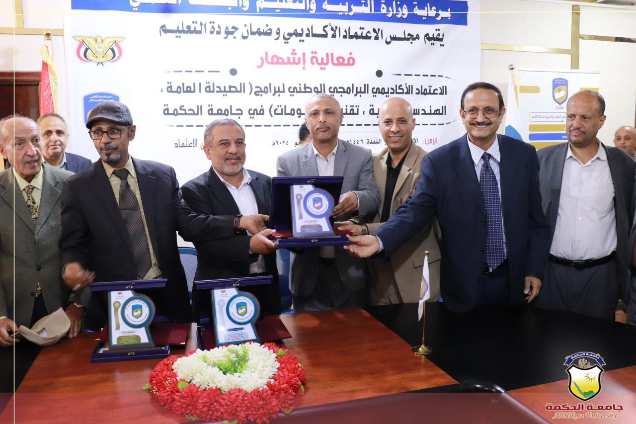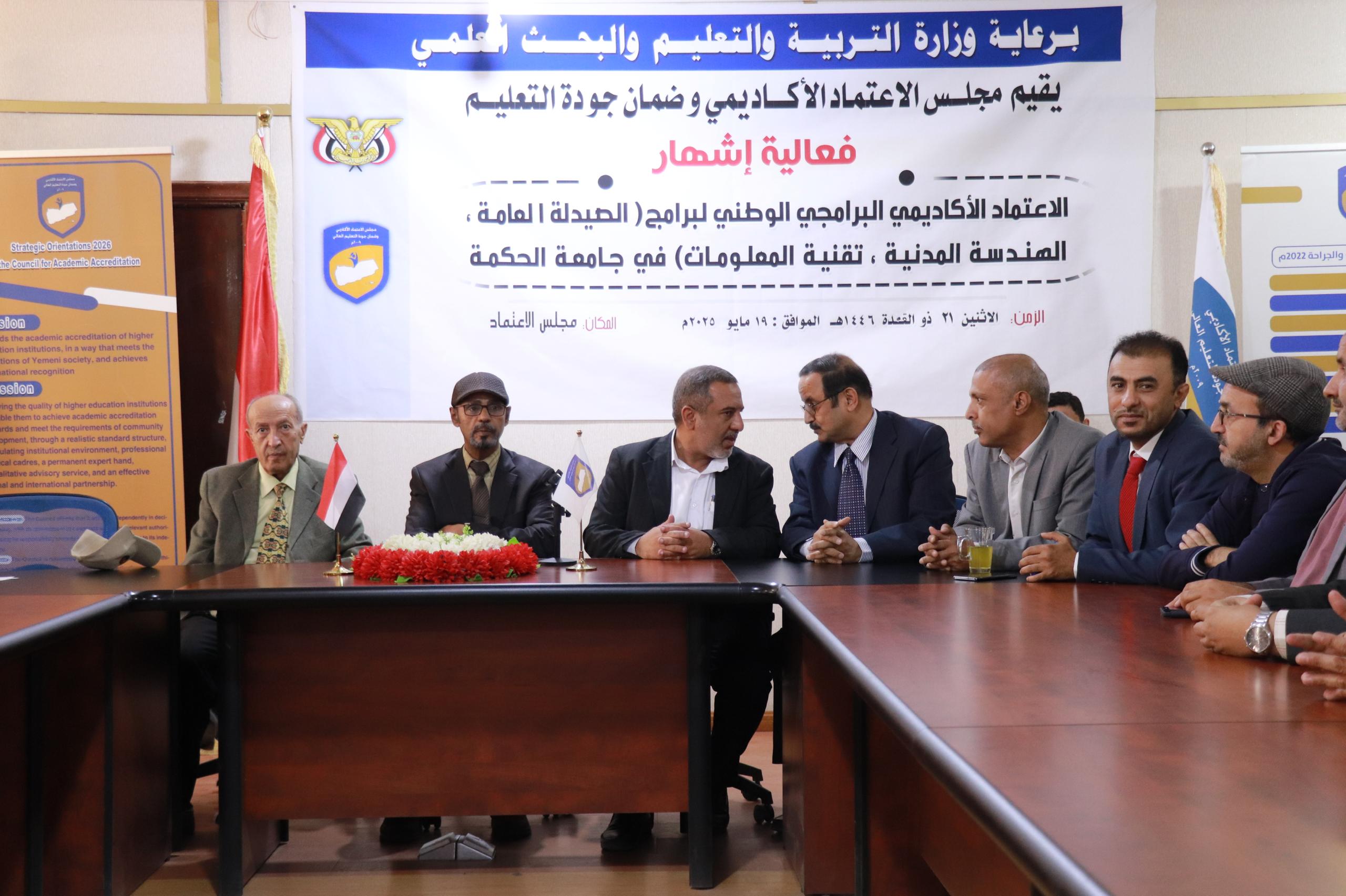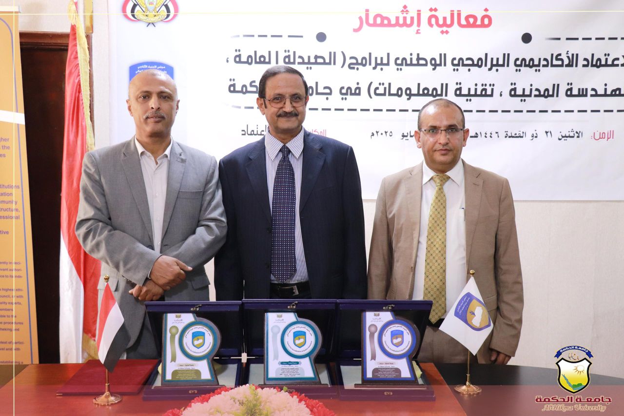 منح مجلس الاعتماد الأكاديمي وضمان الجودة اليوم بصنعاء شهادة الاعتماد الأكاديمي البرامجي الوطني لبرامج "علوم الصيدلة، والهندسة المدنية، وتقنية المعلومات بجامعة الحكمة".