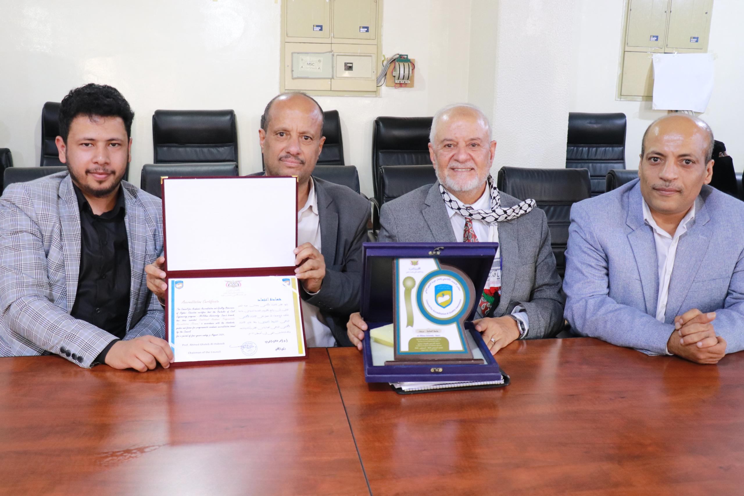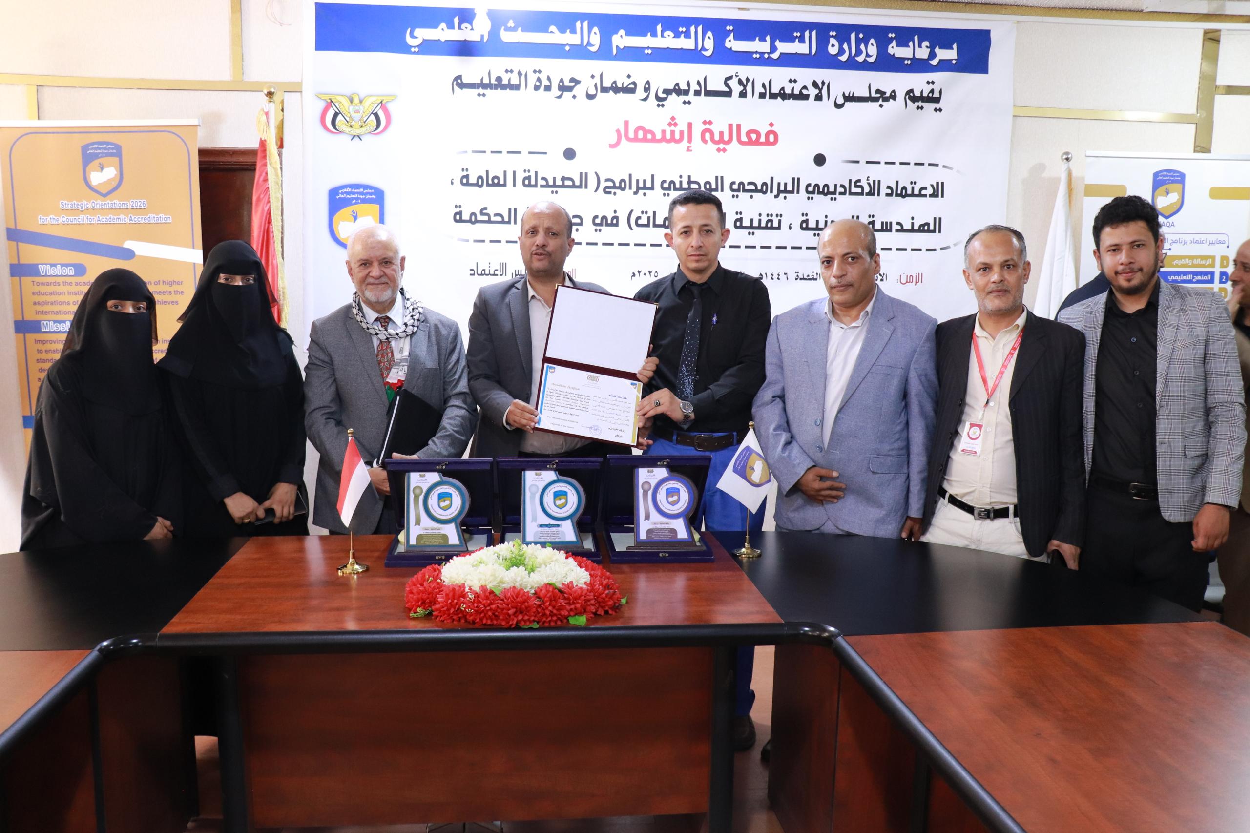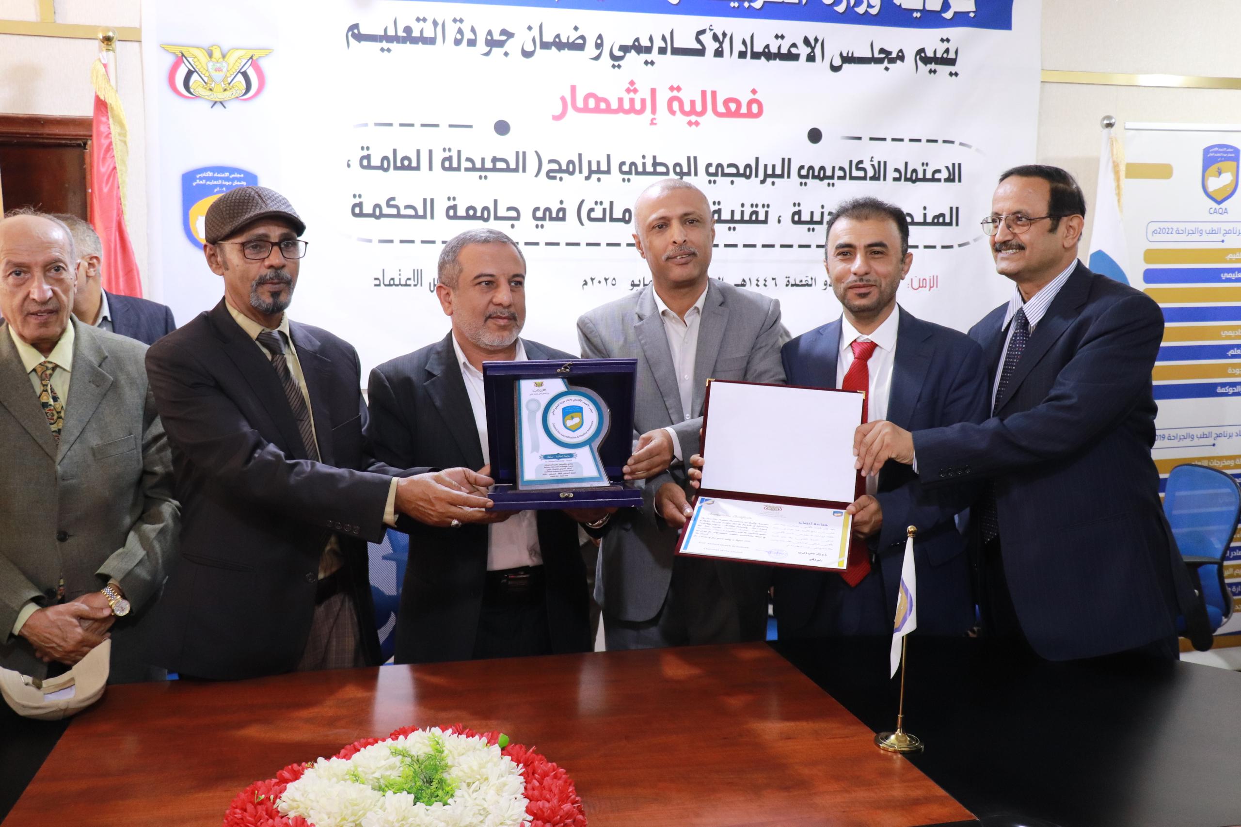منح مجلس الاعتماد الأكاديمي وضمان الجودة اليوم بصنعاء شهادة الاعتماد الأكاديمي البرامجي الوطني لبرامج "علوم الصيدلة، والهندسة المدنية، وتقنية المعلومات بجامعة الحكمة".