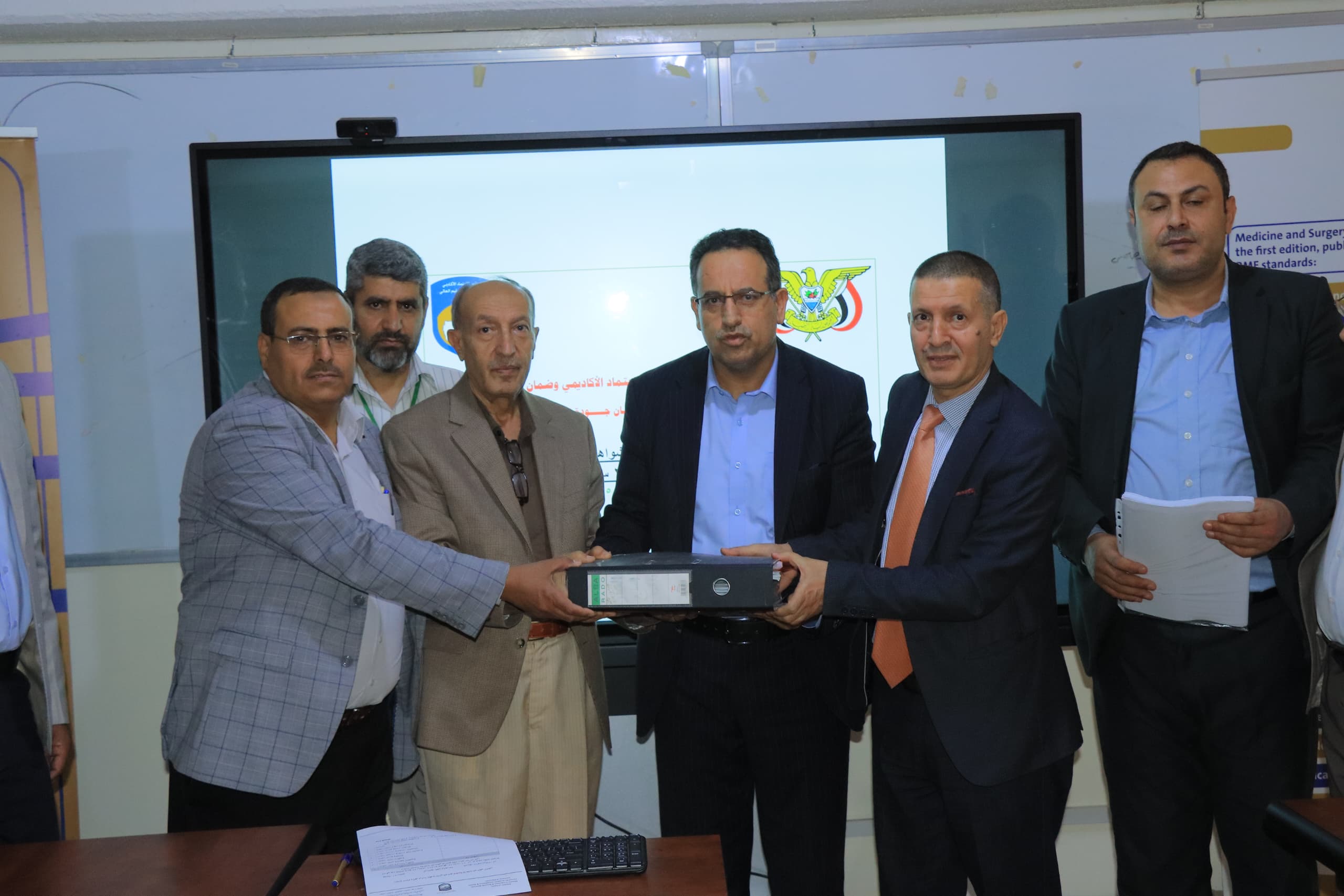 كما حضر عملية التسليم أمين عام الجامعة الأستاذ عبد الكريم الأكحلي، وعميد مركز التطوير وضمان الجودة الدكتور محمد الشماحي، ومدير عام مكتب رئيس الجامعة الأستاذ حسين الشيخ، وأمين كلية الطب الأستاذ ردفان الجماعي، إضافة إلى اللجان المختصة التي عملت على إعداد وتجهيز الوثائق وفق المتطلبات المعتمدة.