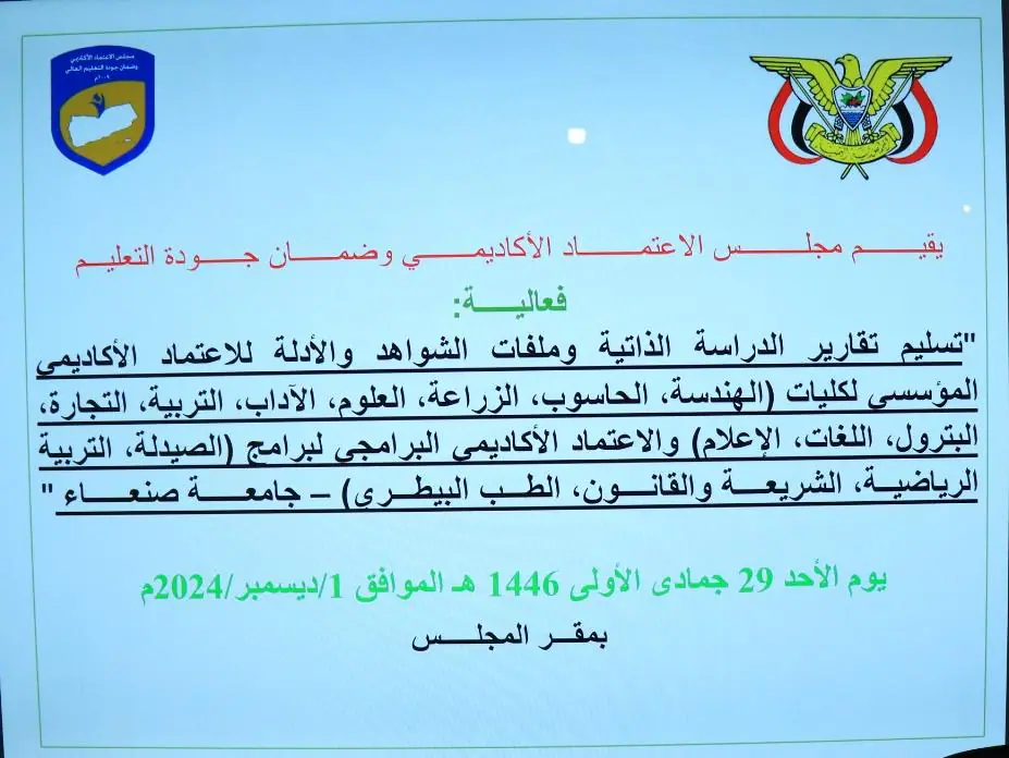 حيث سلّم رئيس جامعة صنعاء الدكتور القاسم عباس التقارير والدراسة الذاتية للكليات ذات البرامج المتعددة بالمجلس إلى رئيس مجلس الاعتماد الأكاديمي وضمان الجودة الدكتور أحمد الهبوب، شملت التقارير والملفات لكليات "الهندسة والحاسوب، تكنولوجيا المعلومات، الزراعة، العلوم والآداب، العلوم الإنسانية، التربية، التجارة والبترول واللغات والإعلام".
