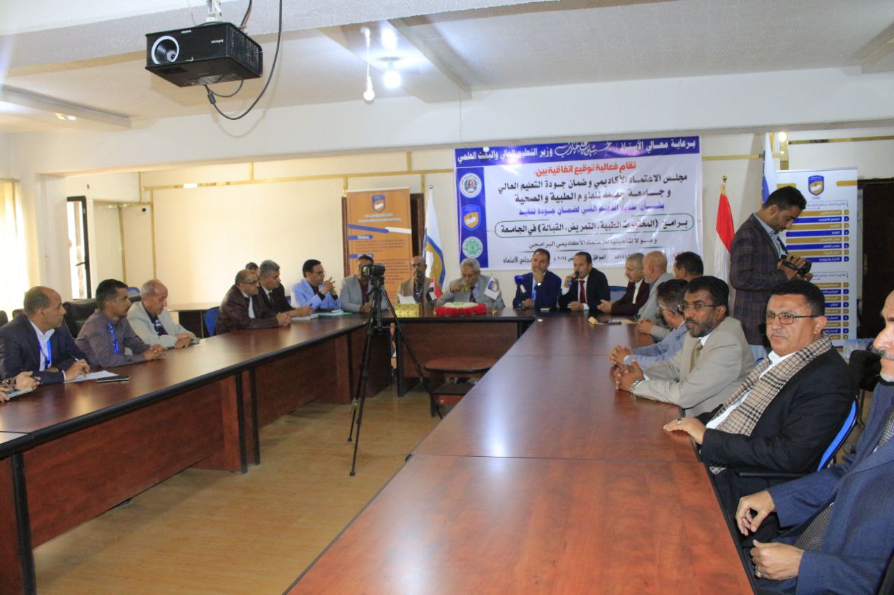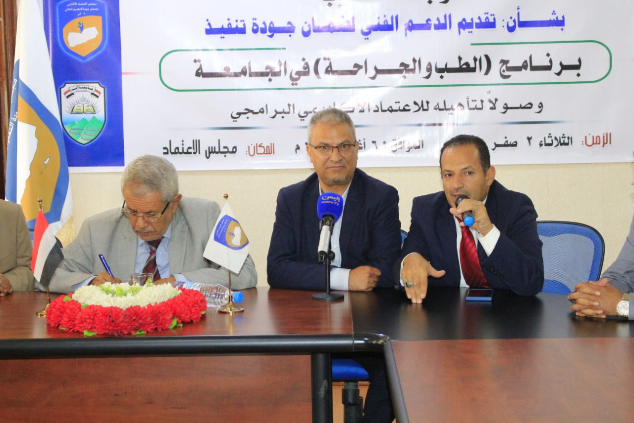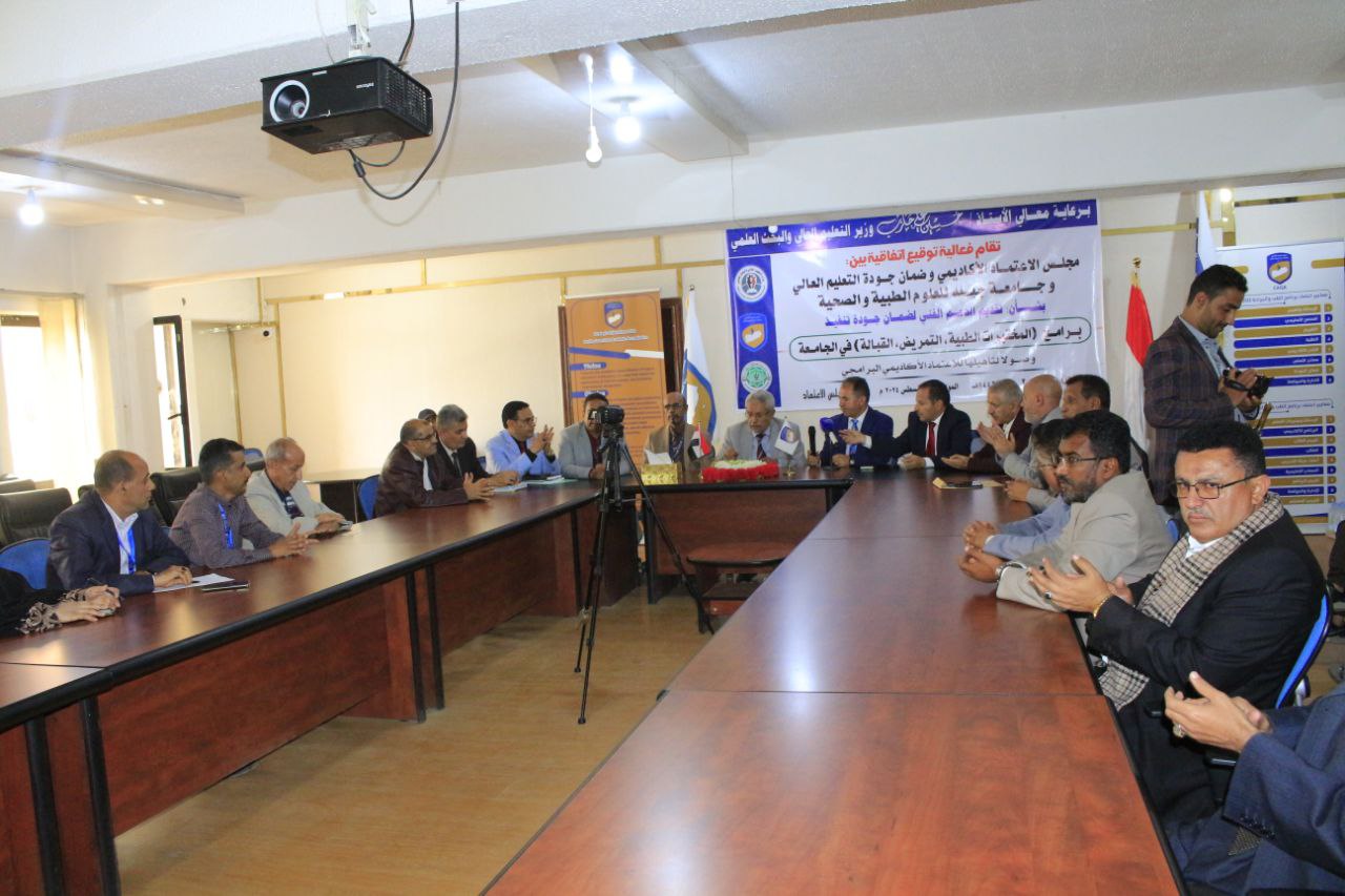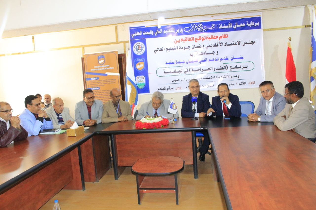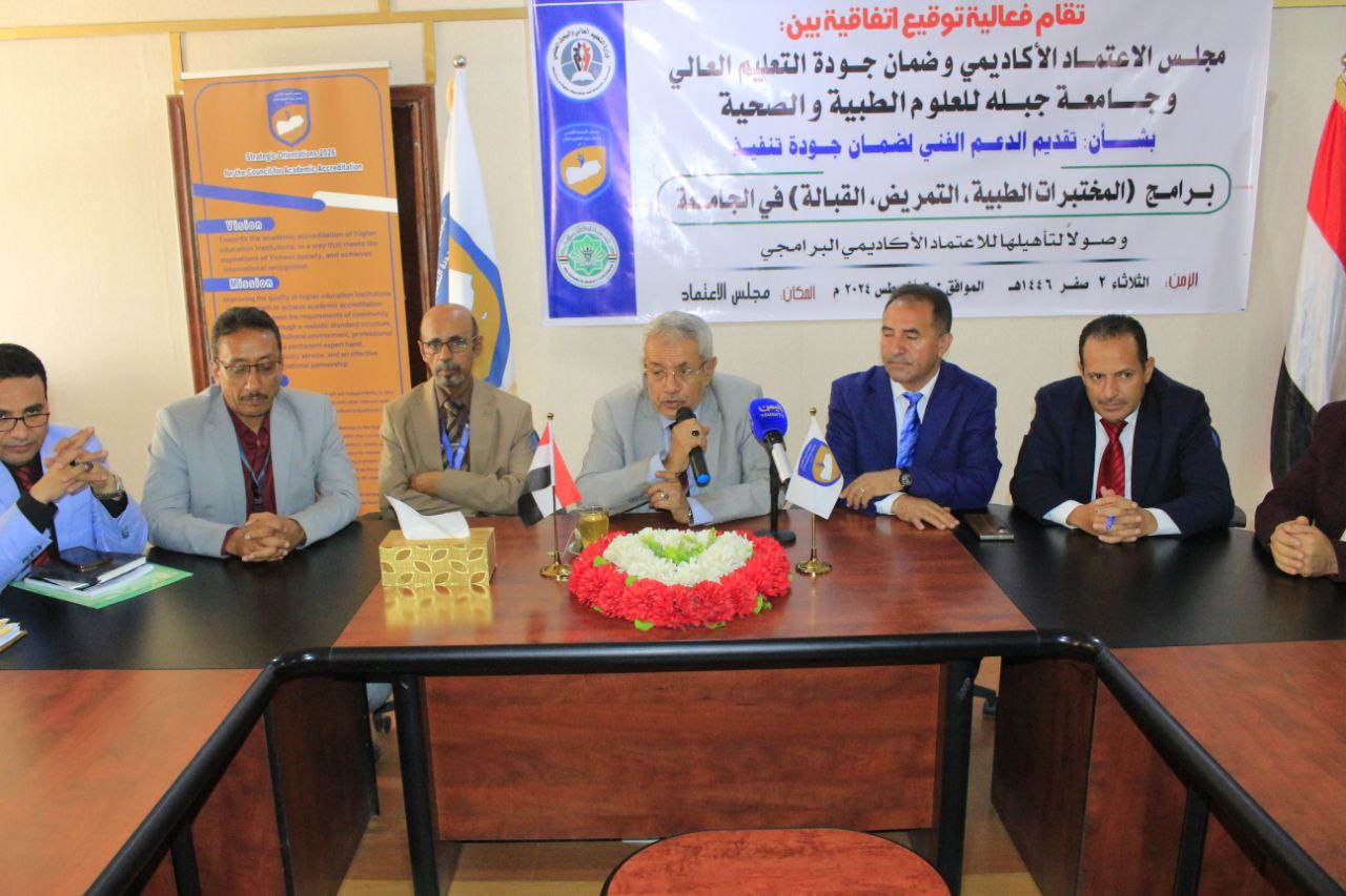 وخلال التسليم بحضور وزير التعليم العالي والبحث العلمي- في حكومة تصريف الأعمال حسين حازب وقع رئيس مجلس الاعتماد الأكاديمي الدكتور أحمد الهبوب، ورئيس الجامعة الدكتور نصر الحجيلي ، اتفاقية التقدم بطلب كتابي موقع ومعتمد من المسؤول المخول قانوناً بالجامعة إلى مجلس الاعتماد بشأن طلب مساعدة المجلس للجامعة في تقديم الدعم الفني والاستشاري لضمان تنفيذ جودة البرامج المذكورة وتأهيلهما للاعتماد الخاص" البرامجي" .