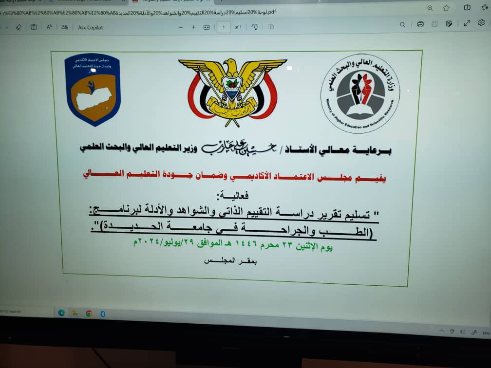 صنعاء- سبأ : تسلّم مجلس الاعتماد الأكاديمي وضمان الجودة اليوم دراسة التقييم الذاتي والشواهد والأدلة لبرنامج الطب والجراحة العامة في جامعة الحديدة.